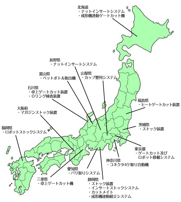 導入実績 自動車用卓上ゲートカット機(ヒーター仕様)コンテナ交換用ストック装置携帯電話用板金インサートシステム医療用軟質ゲートカットシステム高温用金具インサートシイステム成形機画面連動ゲートカットストックシステムブロー成形機用取出ストックシステム端子ピン(0.6㎜)金型インサートシステム ■■ムラマツ製品を見る■■ 導入MAP 設置例